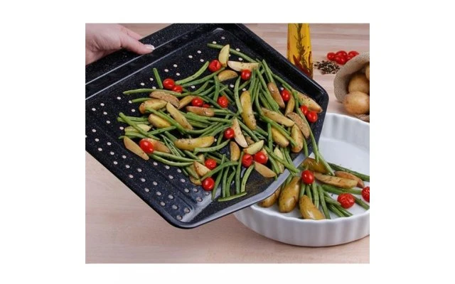 De geperforeerde energiesparende bodem is ideaal geschikt voor friet, ktoketten, baguettes, broodjes etc. – de warmte wordt door de openingen optimaal rond het bakproduct verdeeld.