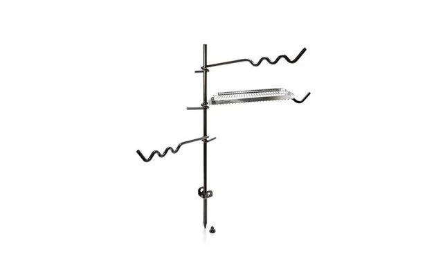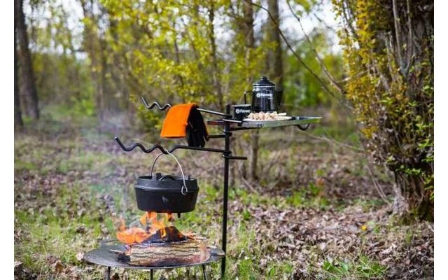 Uw brandanker heeft een hoofdstang die in de grond wordt vastgezet en drie armen die u afzonderlijk aan het brandanker kunt bevestigen en in hoogte en oriëntatie kunt variëren. Twee van de armen hebben inkepingen aan de uiteinden waaraan u uw kookgerei kunt ophangen. De derde arm heeft een grillrooster en een extra inkeping voor uw grillhandschoenen of grill- en houtskooltangen. Worstjes, groentespiesjes en dergelijke kunnen veilig op het royale grillrooster met opstaande rand worden gelegd.