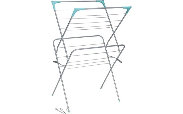 Buitengewoon ruimtebesparend en heeft een zeer vlakke ingeklapte maat van slechts 5 cm. De zijdelingse vastzetbeugels zorgen voor een stevige stand, als extra kan het wasrek met tentharingen (inbegrepen) worden vastgezet. Lengte van de waslijnen in totaal ongeveer 9,3 m.