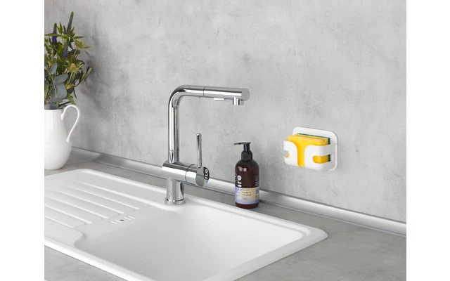 De decoratieve houder van wit kunststof kan overal worden neergezet en de spons is dus altijd binnen handbereik